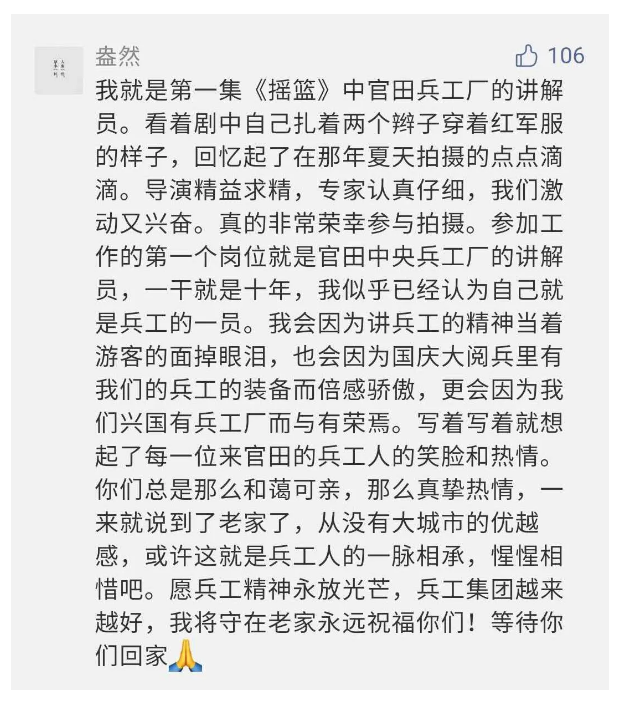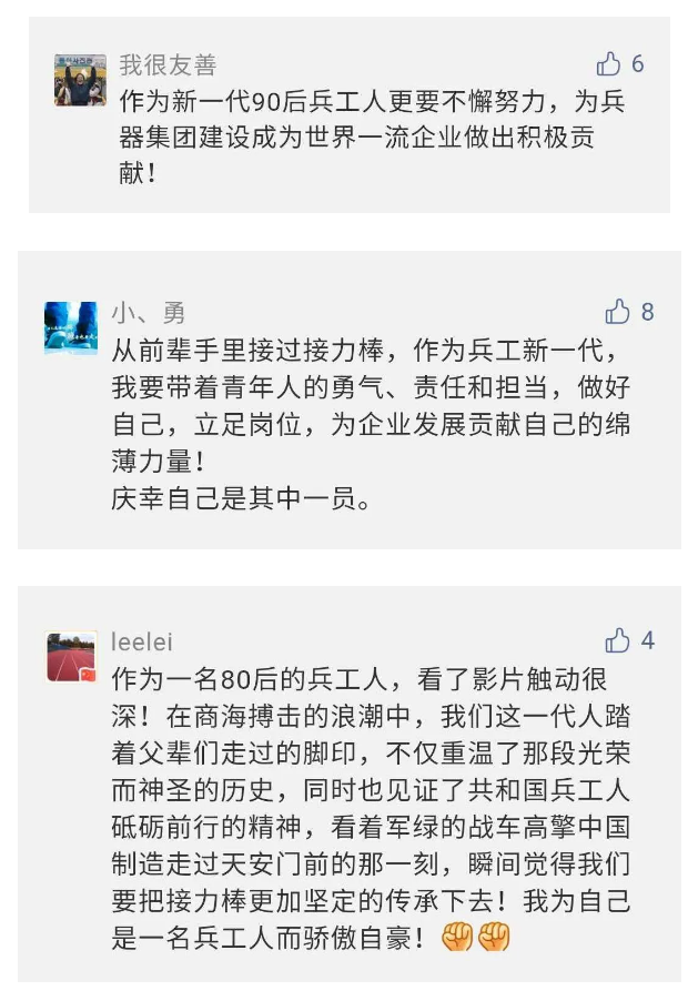 在中國共產(chǎn)黨成立九十九周年之際,由中國兵器工業(yè)集團有限公司組織攝制、反映人民兵工在黨的領(lǐng)導下80余年光輝奮斗歷程、廣大兵工人弘揚“把一切獻給黨”人民兵工精神的三集紀錄片《人民兵工》自7月1日-3日每晚20點在中央廣播電視總臺中文國際頻道(CCTV-4)《國家記憶》首播以來,在兵器系統(tǒng)和觀眾中引發(fā)強烈反響,很多網(wǎng)友、觀眾紛紛留言表達了自己的觀后感受。 觀眾在兵器工業(yè)集團官微的留言區(qū)直抒了觀影感受,有的熱淚盈眶,有的心潮起伏,有的興起賦詩,有的認為讓心靈得到凈化、思想得以提升,有的認為是最直觀的國防教育教材...... 影片勾起了退休老同志無限懷念、兵工人的甜美記憶、攝制期間官田中央兵工廠文化教育基地工作人員的難忘瞬間...... 相比老一輩,年a輕的兵工人也表達了傳承紅色基因,弘揚新時代“把一切獻給黨”的人民兵工精神的豪邁氣概...... 其中也不乏在校的學生,在感謝英模樹立的榜樣和豐碑的同時,也為自己的職業(yè)生涯定好坐標、做好規(guī)劃,努力前行...... 作為新時代弘揚人民兵工精神的特色文化成果,紀錄片的播出,凝聚起廣大兵器干部職工團結(jié)奮斗新時代磅礴力量,極大的增強了兵工人的自豪感,大家紛紛表達了作為軍工央企一員 “此生無悔入軍工”的使命擔當...... 《人民兵工》共分為三集,分別是《搖籃》《錘煉》《前行》,全景式展示了我們黨領(lǐng)導和創(chuàng)建的第一個軍事工業(yè)部門——人民兵工80余年來從無到有、從小到大、從弱到強的光輝奮斗歷程,生動講述了廣大兵工人聽黨話、跟黨走,大力弘揚“把一切獻給黨”的人民兵工精神,自力更生、艱苦奮斗、開拓進取、無私奉獻的家國情懷和感人事跡。在人民兵工80余年篳路藍縷的奮斗歷程中,涌現(xiàn)出吳運鐸、倪志福、祝榆生等一大批英模人物,在血與火的考驗中凝練形成了“把一切獻給黨”的人民兵工精神,成為人民兵工奮斗不息的紅色基因。(王珊) |