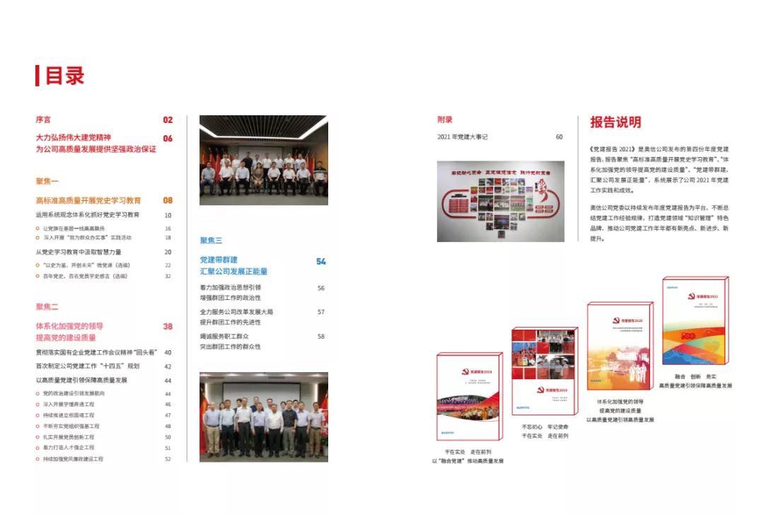 作為奧信公司黨建工作創(chuàng)新成果,《黨建報告2021》聚焦 “高標(biāo)準(zhǔn)高質(zhì)量開展黨史學(xué)習(xí)教育”、“體系化加強黨的領(lǐng)導(dǎo)提高黨的建設(shè)質(zhì)量”、“黨建帶群建,匯聚公司發(fā)展正能量”,全面展示了公司2021年黨建工作實踐與成效。報告既是奧信公司黨委和16個黨支部、102名共產(chǎn)黨員向上級黨組織交出的一份黨建工作答卷,也是弘揚偉大建黨精神,奮力走好新時代“趕考之路”,以高質(zhì)量黨建引領(lǐng)保障高質(zhì)量發(fā)展,不斷推動企業(yè)做強做優(yōu)做大的動員令。