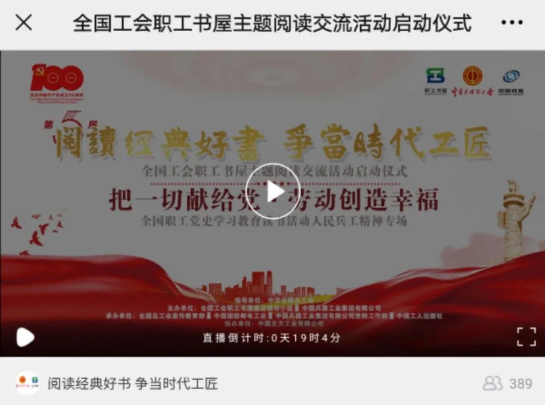 又到一年世界讀書日,激蕩在全國(guó)職工朋友心中的“閱讀經(jīng)典好書 爭(zhēng)當(dāng)時(shí)代工匠”又一次在神州大地叫響。今年,“把一切獻(xiàn)給黨 勞動(dòng)創(chuàng)造幸福”成為了閃亮的主題,在億萬職工中掀起心潮。 今天(4月23日)下午 15:00,第五屆“閱讀經(jīng)典好書 爭(zhēng)當(dāng)時(shí)代工匠”全國(guó)工會(huì)職工書屋主題閱讀交流活動(dòng)啟動(dòng)儀式暨“把一切獻(xiàn)給黨·勞動(dòng)創(chuàng)造幸?!?/strong>全國(guó)職工黨史學(xué)習(xí)教育讀書活動(dòng)人民兵工精神專場(chǎng)隆重開啟! 多項(xiàng)閱讀計(jì)劃同場(chǎng)發(fā)布、多本經(jīng)典好書現(xiàn)場(chǎng)推薦、多位職工誦讀演繹紅色經(jīng)典、勞模代表進(jìn)行閱讀分享和倡議,讓我們共同在閱讀中感悟紅色經(jīng)典,在活動(dòng)中傳承精神力量。 這一年一度的全國(guó)職工閱讀盛典,你還在等什么! 看!在建黨百年的歷史節(jié)點(diǎn),職工現(xiàn)場(chǎng)誦讀紅色經(jīng)典《把一切獻(xiàn)給黨》,傳承以吳運(yùn)鐸為代表的人民兵工精神,感悟經(jīng)典的魅力和信仰的力量。 聽!來自兵器工業(yè)集團(tuán)的全國(guó)勞模代表在現(xiàn)場(chǎng),向廣大職工朋友發(fā)出閱讀倡議。分享在黨的領(lǐng)導(dǎo)下,大國(guó)重器由跟仿跟研到世界領(lǐng)先的蛻變。 來!聚焦現(xiàn)場(chǎng),正式啟動(dòng)第五屆“閱讀經(jīng)典好書 爭(zhēng)當(dāng)時(shí)代工匠”全國(guó)工會(huì)職工書屋主題閱讀交流活動(dòng),同時(shí)點(diǎn)亮專屬人民兵工精神的火炬,讓閱讀熱情傾力綻放。 40余家省級(jí)工會(huì)新媒體 100余家市級(jí)工會(huì)新媒體 200余家知名企業(yè)工會(huì)新媒體 同步直播 精彩即將上演 直播在哪看? STEP1 關(guān)注全總職工書屋微信號(hào) 點(diǎn)擊下方菜單欄-活動(dòng)專區(qū) 觀看直播啦 還可以同步觀看圖片直播 記錄下每個(gè)精彩時(shí)刻 |