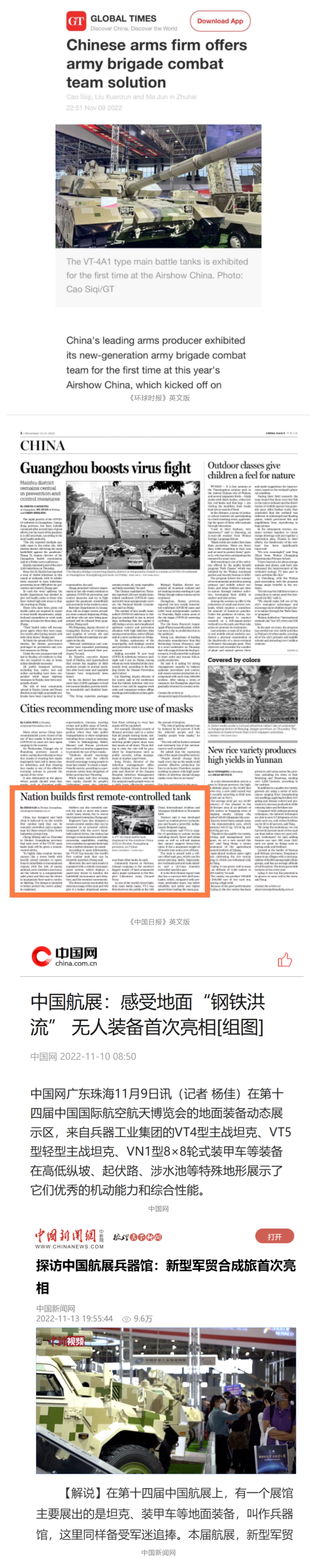 央視國防軍事頻道航展特別報道《炫舞天地間》11月12日《賞“鐵甲雄風(fēng)”!看航展地面裝備“鋼鐵洪流”名場面》對兵器工業(yè)集團武器裝備特色亮點進行報道?!秶儡娛略鐖蟆?1月7日推出報道《第十四屆中國國際航空航天博覽會明天開幕 中國兵器館首次以陸軍合成旅實戰(zhàn)體系形式展出》,對兵器館陸軍合成旅實戰(zhàn)體系進行報道?!盾娛聢蟮馈?1月9日推出《第十四屆中國國際航空航天博覽會 地面兵器裝備首次聯(lián)合陸航直升機進行動態(tài)展示》報道?!盾娒孕刑煜隆?1月9日推出報道《軍迷打卡航展2022》以專業(yè)軍迷視角探館兵器館,全面展示兵器工業(yè)集團參展裝備特色亮點。