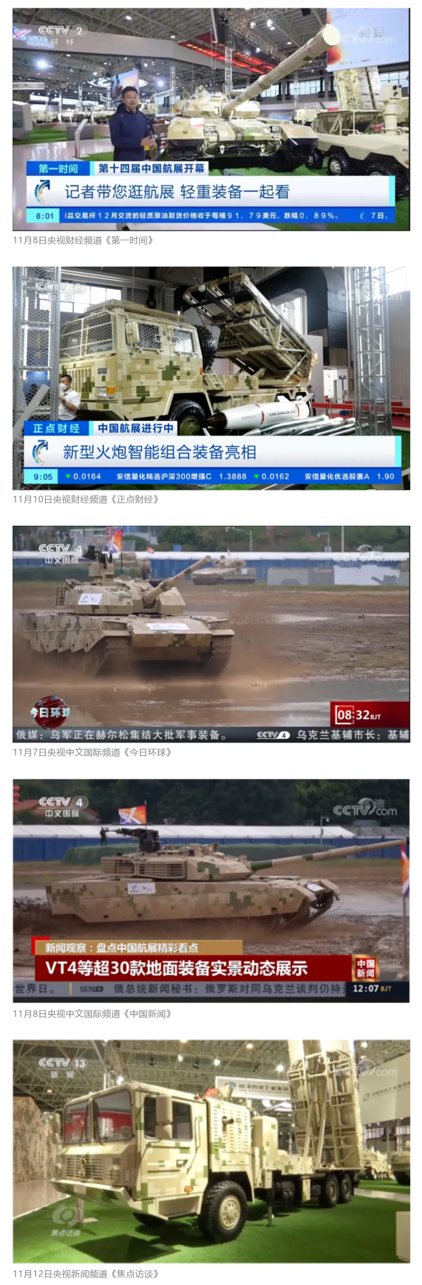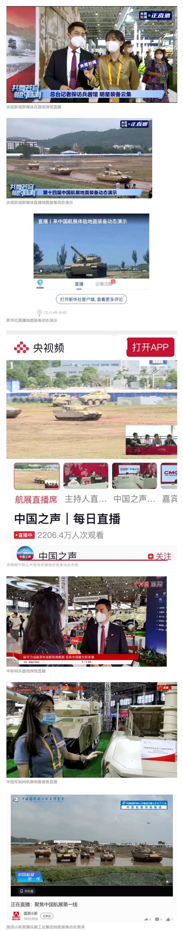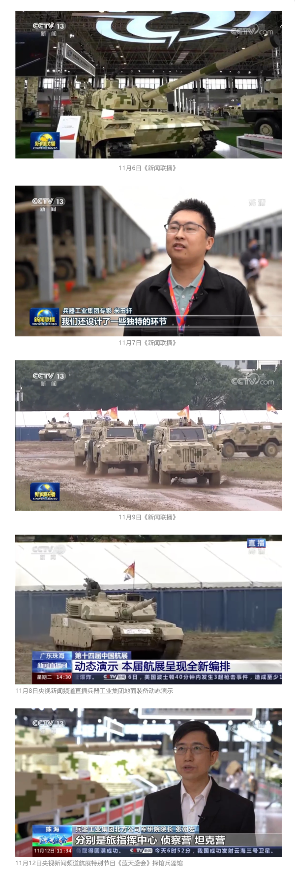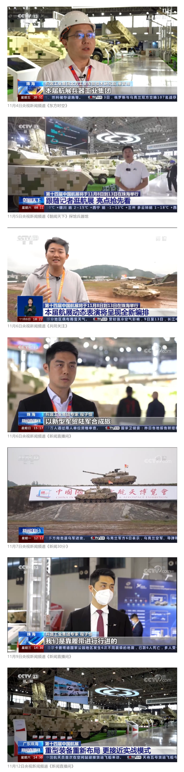 此次航展,央視新聞頻道《朝聞天下》《新聞直播間》《東方時空》《共同關(guān)注》《新聞30分》《24小時》、央視國防軍事頻道《國防軍事早報》《軍事報道》《軍迷行天下》、央視國際頻道《中國新聞》《今日環(huán)球》等欄目共播出兵器工業(yè)集團參展相關(guān)新聞報道30余條。