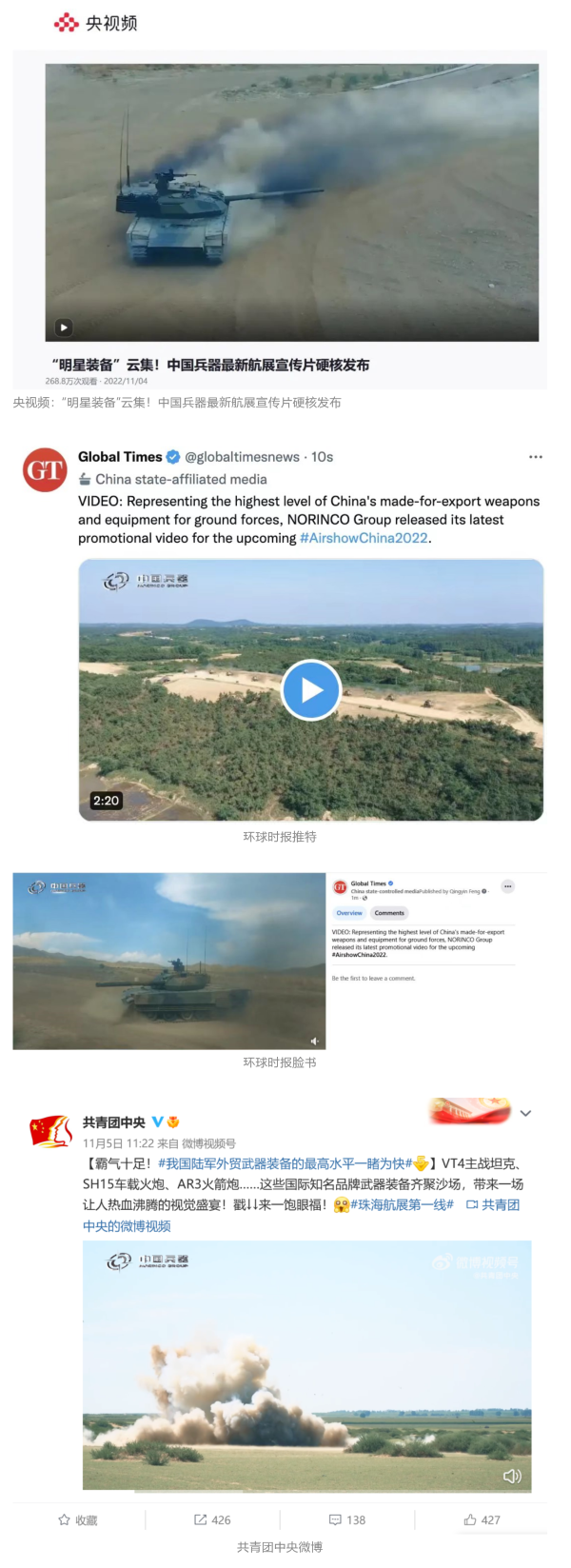 人民日報官方微博、微信公眾號,新華社客戶端、央視新聞客戶端、中國日報微博、參考消息微信公眾號、解放軍報微博、央視軍事微博、CGTN微博、中國軍號微博、共青團中央微博、環(huán)球時報(英文網(wǎng)站、臉書賬號、推特賬號)、嗶哩嗶哩、學(xué)習(xí)強國平臺、國資小新視頻號、網(wǎng)易軍事、騰訊軍事、鳳凰軍事、北京日報、東方衛(wèi)視看看新聞全媒體、北京電視臺等20余家中央主流媒體、國家部委、省市媒體的新媒體第一時間播發(fā)集團公司航展宣傳片等視頻作品燃爆全網(wǎng),累計閱讀量突破1700萬人次。集團公司微信公眾號、微博、抖音號、快手號、微信視頻號、知乎號等新媒體宣傳片播放閱讀量超過800萬人次,點贊超過30萬人次。集團公司微信公眾號推出《硬核!中國兵器最新航展宣傳片發(fā)布》《中國兵器航展節(jié)目單,請選出心中明星裝備》《航展首日,中國兵器閃耀亮相!》等7篇報道,閱讀量超過25萬人次,集團公司微信視頻號、抖音號、快手號等新媒體賬號發(fā)布“中國兵器航展大秀”系列視頻,觀看量超過330萬人次。