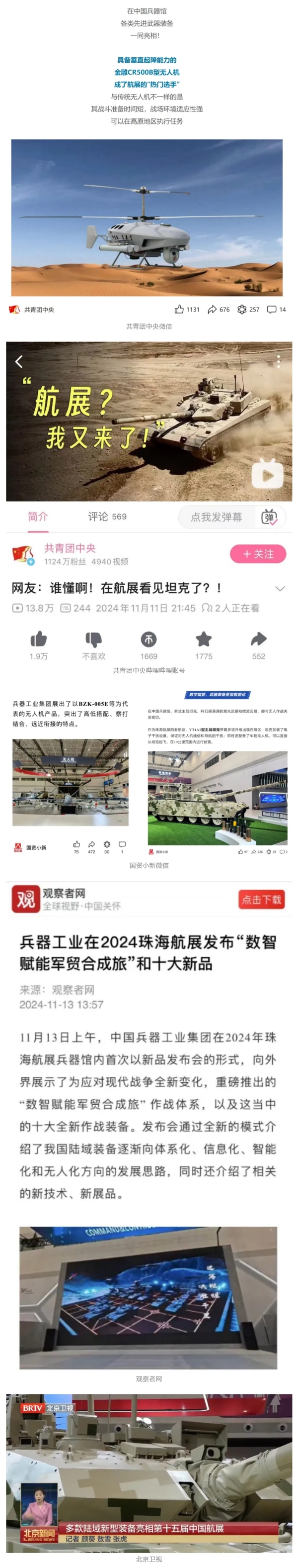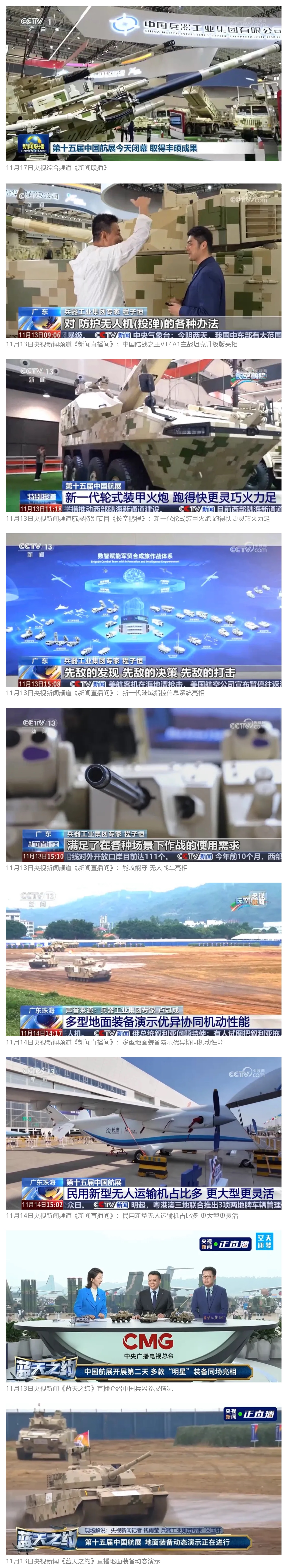11月13日央視新聞《藍(lán)天之約》直播地面裝備動(dòng)態(tài)演示此次航展,央視綜合頻道《新聞聯(lián)播》《晚間新聞》、新聞?lì)l道《新聞直播間》《新聞30分》《朝聞天下》《共同關(guān)注》《東方時(shí)空》《午夜新聞》、財(cái)經(jīng)頻道《天下財(cái)經(jīng)》《經(jīng)濟(jì)信息聯(lián)播》《正點(diǎn)財(cái)經(jīng)》《第一時(shí)間》、中文國際頻道《今日環(huán)球》《中國新聞》、國防軍事頻道《軍事報(bào)道》《正午國防軍事》《國防軍事早報(bào)》《軍迷行天下》等欄目共播出兵器工業(yè)集團(tuán)參展相關(guān)新聞報(bào)道40余條。11月10日央視新聞?lì)l道《新聞30分》11月10日央視中文國際頻道《中國新聞》11月10日央視國防軍事頻道《軍事報(bào)道》11月11日央視國防軍事頻道《正午國防軍事》
