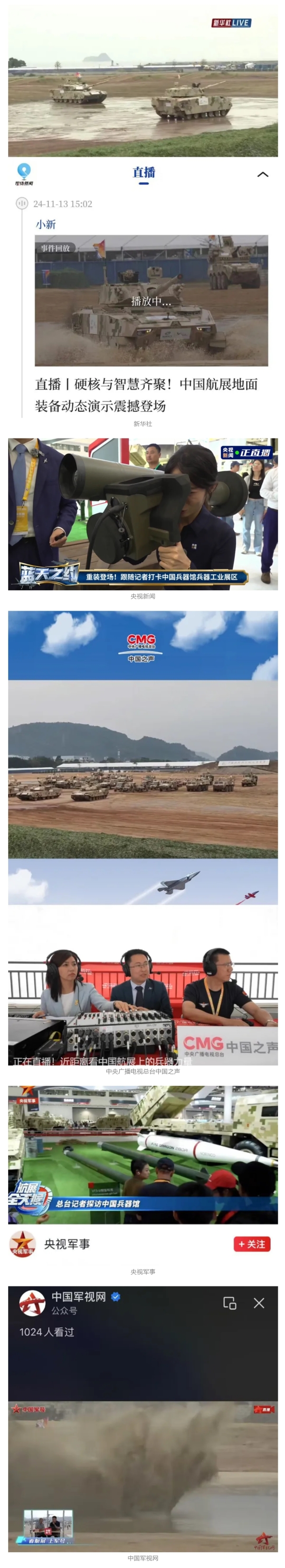新華社、央視新聞、中央廣播電視總臺(tái)中國之聲、央視軍事、中國軍視網(wǎng)、廣東廣播電視臺(tái)等媒體以及國家國防科工局、國資小新等到兵器工業(yè)集團(tuán)地面動(dòng)態(tài)演示區(qū)、中國兵器館進(jìn)行了直播。